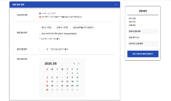 3단계: 날짜, 시간대 선택 후 신청 하루 최대 2,000명까지 선착순 예약 예약은 관람 1일 전까지 가능